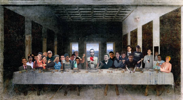 Una de las obras más míticas de la historia de la humanidad es La última cena de Leonardo Da Vinci, de quien Walter Isaacson hace una fantástica biografía. La última cena cuenta con más de 500 años a sus espaldas y sigue fascinando a generaciones enteras de artistas y, como no, a pariodistas. Es quizás la obra visual más parodiada, a parte de la célebre Abbey Road, la cual también pariodé en su momento pero nunca publiqué (solo los verdaderos Troll Inc. la han visto). La recreación de La última cena homenajea a mis amigos de la época pre-universitaria y a otras personas que, por cualquier motivo, fueron fundamentales para la creación de mi identidad personal.